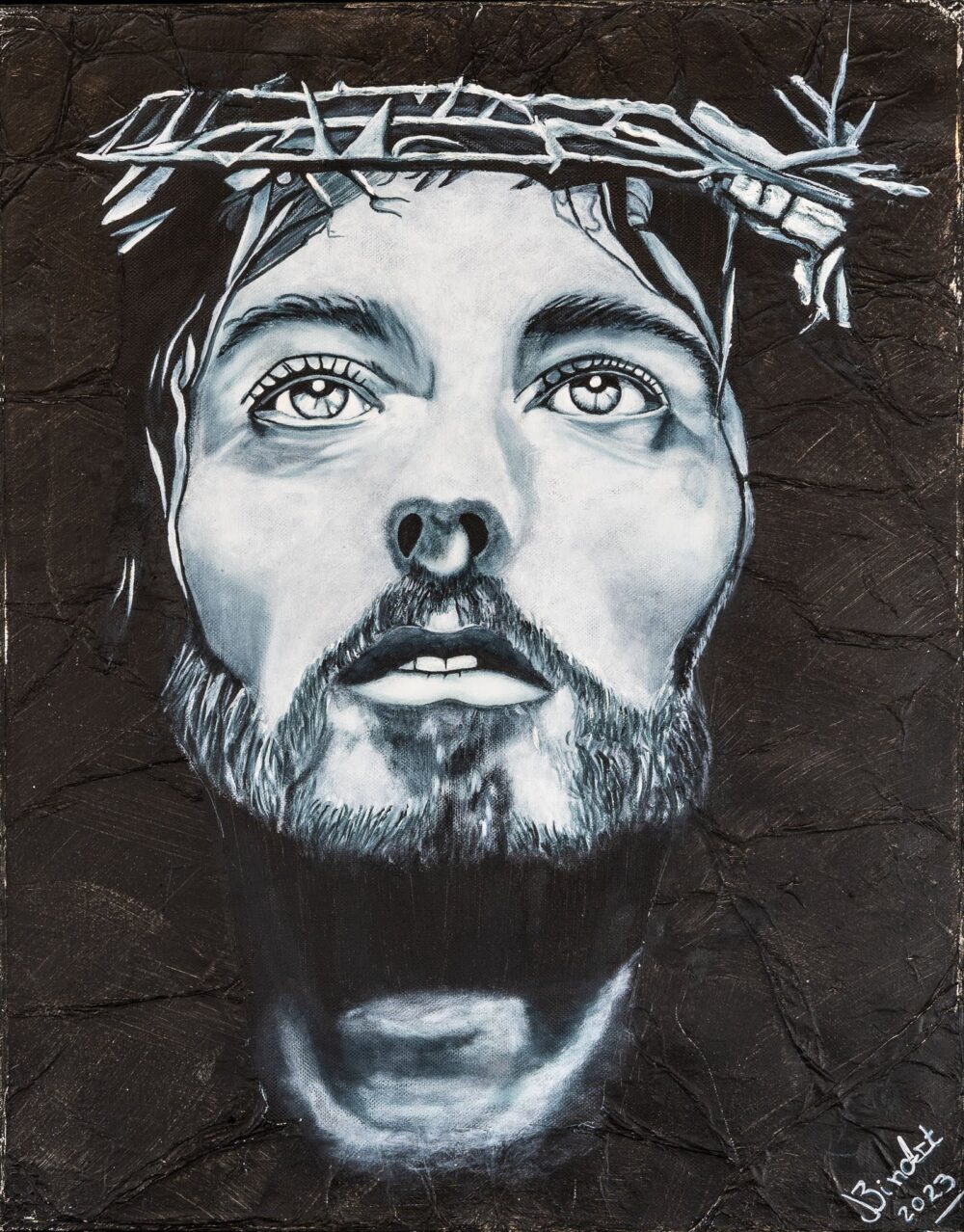"Denn sie wissen nicht, was sie tun" ist 2023 anlässlich der 900-Jahr-Feier unseres Kloster Kamp in Kamp-Lintfort entstanden und ausgestellt worden. Besonders fasziniert hat mich der Gesichtsausdruck, im besonderen der Blick. Trotz der dramatischen Geschichte, die sich um seinen Tod rankt, wirkt Jesus selbst, als ergäbe er sich vergebungsvoll in das ohnehin Unvermeidliche. Was mich als Künstlerin besonders freut ist, dass es für viel Gesprächsstoff sorgt. Zum einen, weil jeder Betrachter etwas anderes sieht und empfindet und jeder seine ganz persönlichen Verbindungen herstellt. Zum anderen wegen der verwendeten Materialien und Techniken:
