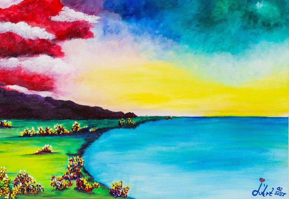 Ursprünglich entstanden ist das Motiv auf DIN A4 Aquarellpapier. Das Ergebnis hat mir und vielen Betrachtern so gut gefallen, dass ich es für eine Ausstellung auf eine 3D-Leinwand drucken ließ. Um dem ganzen den reinen Reproduktionscharakter eines Kunstdruckes zu nehmen, entschloss ich mich, mit Seidenpapier Struktur zu erzeugen und die Farben darauf nochmal aufzutragen. Das Ergebnis ist ein farbintensives leuchtendes MixedMedia-Kunstwerk.